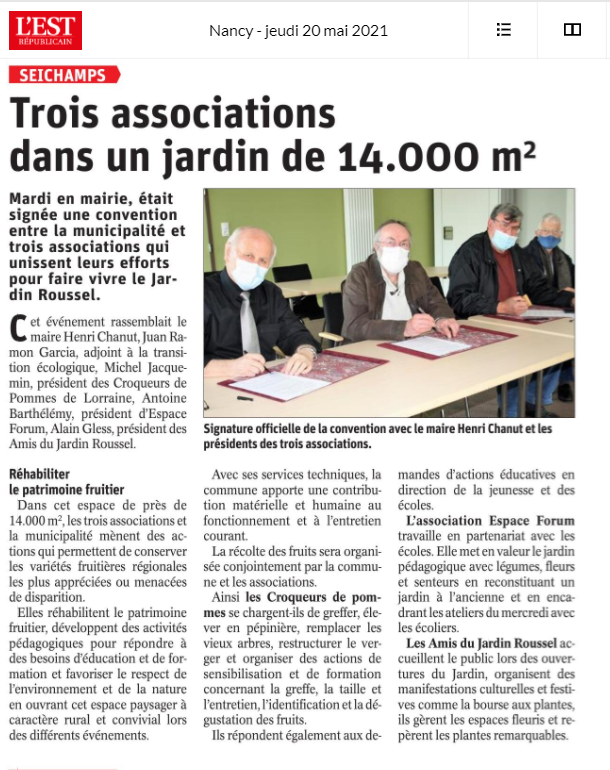 Une nouvelle convention vient d’être signée entre la mairie de Séchamps et 3 associations, dont les « Croqueurs de Pommes de Lorraine ». Voir article de l’Est-Républicain du 20 mai 2021, ci-joint :