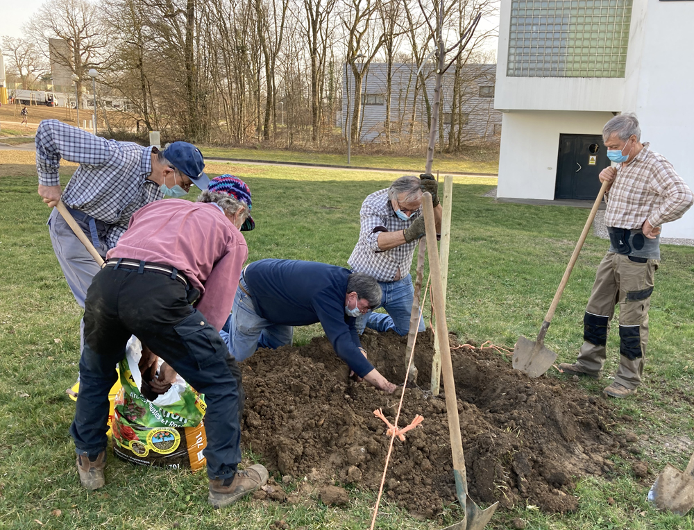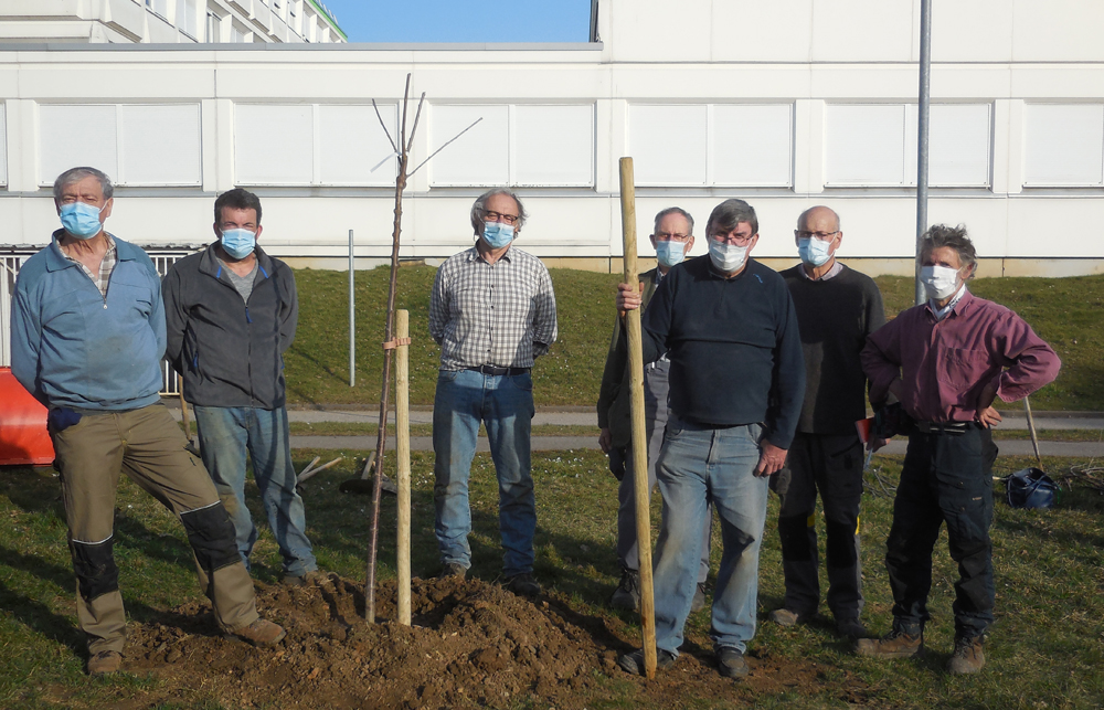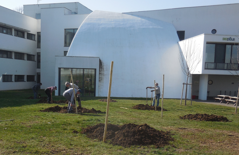 Ce 2 mars 2021 à 14h, c’est sous un soleil radieux qu’une équipe de 7 croqueurs a été accueilli par Mme SAUDER, enseignante et responsable à la faculté de pharmacie, botanique et mycologie. On a procédé à la plantation de 10 arbres dont 5 pommiers, 2 pruniers, 2 cerisiers et 1 poirier, devant le « BIOPOLE ».