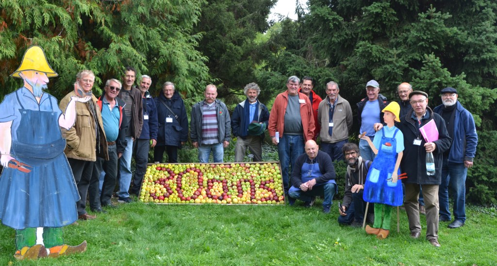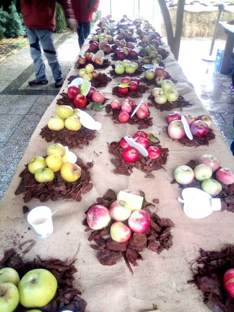 A l’entrée, les visiteurs pouvaient découvrir le « bonhomme CROQUEUR » et sa fille près d’une mosaïque annonçant nos 30 ans (photo jointe), puis ils arrivaient à l’exposition où nous avons pu présenter plus de 150 variétés de pommes.