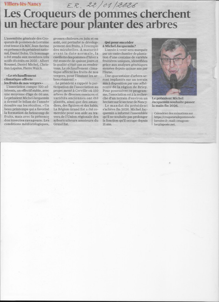 Pour 2026, l’association est à la recherche d’un terrain de 1 hectare (de préférence à 20-30 kms de Nancy) pour l’implantation d’une centaine de pommiers et de poiriers qui sont uniques en Europe.