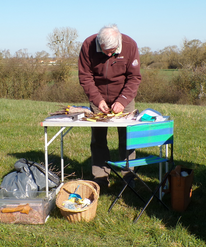 Nous étions 5 greffeurs : Etienne, François, Guy, Hervé et Michel qui ont œuvré (à genoux) pendant que Bernard préparait les greffons et que Renée mettait à jour le plan.